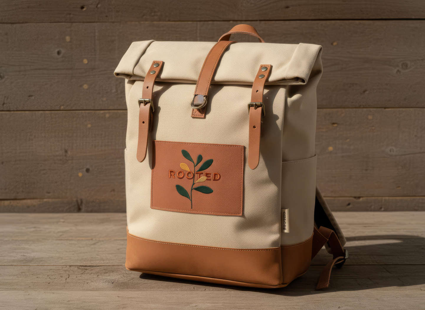 промпт (рюкзак) — Minimalist canvas backpack for «Rooted» festival. Simple form, organic material, stitched logo patch in warm terracotta tone. Natural palette — sand, green, brown. Styled on wooden background with soft daylight. Feels calm, natural, and refined. (Nano Banana)