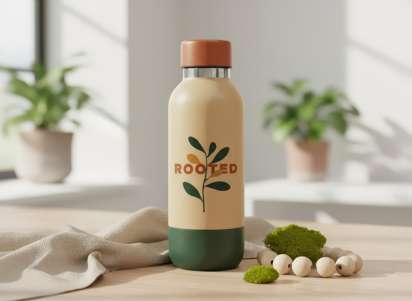 промпт (бутылка) — Eco water bottle design for the «Rooted» festival. Sleek, modern silhouette in matte metal or bamboo, with minimalist engraved «Rooted» logo. Warm earthy palette — sand beige, deep green, terracotta cap accent. Surrounded by soft fabric and natural wood props. Lifestyle composition that feels eco-conscious, fresh, and premium. (Nano Banana)