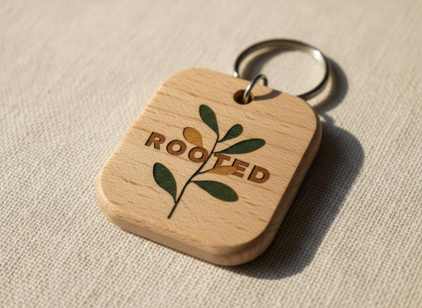 промпт (брелок) — Wooden keychain for «Rooted» festival. Small minimalist design with laser-engraved logo. Smooth natural wood grain, warm matte finish, handmade aesthetic. Photographed on a linen surface with warm light. Calm, modern, tactile. (Nano Banana)