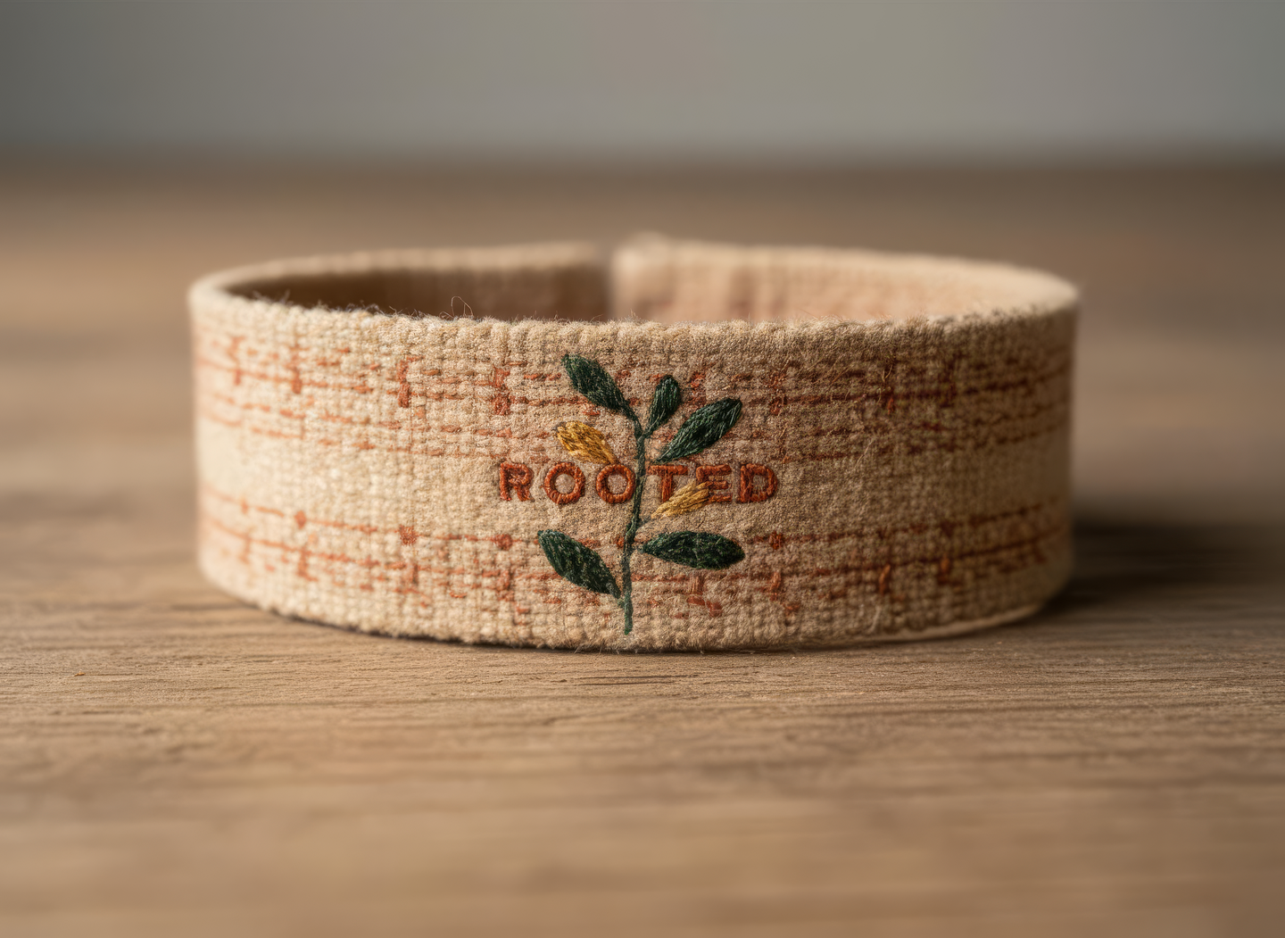 промпт (браслет) — Festival wristband design for «Rooted». Made of woven natural fibers or soft recycled fabric. Subtle earthy tones — clay, sand, muted green. The «Rooted» logo printed or stitched in fine detail. Photographed close-up with natural light, shallow depth of field, warm organic tone. Feels artisanal, elegant, and modern. (Nano Banana)