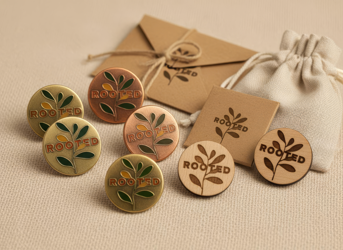 промпт (пины) — Minimal metal or wooden pins for «Rooted» festival. Small round shape with engraved or enamel logo. Earthy colors, natural surface texture, minimalist packaging. Close-up product shot, clean and warm. (Nano Banana)