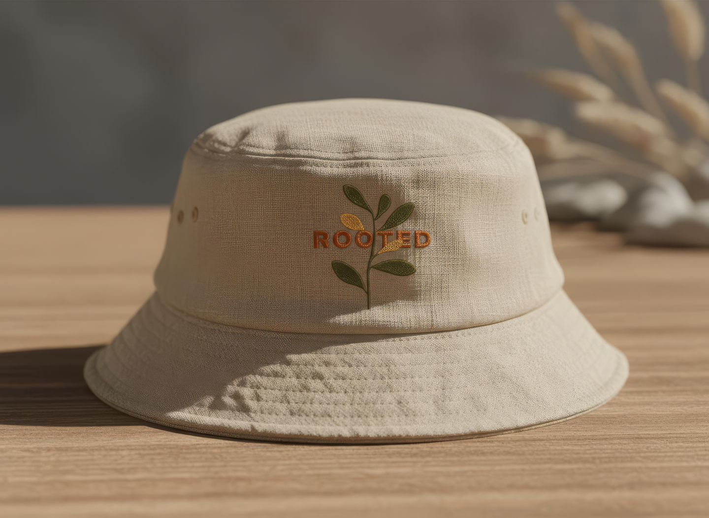 промпт (панама) — Soft linen bucket hat for «Rooted» festival, in muted sand or terracotta shade. Subtle embroidered logo in warm gold. Natural folds, organic feel, daylight composition. Modern eco-casual aesthetic. (Nano Banana)