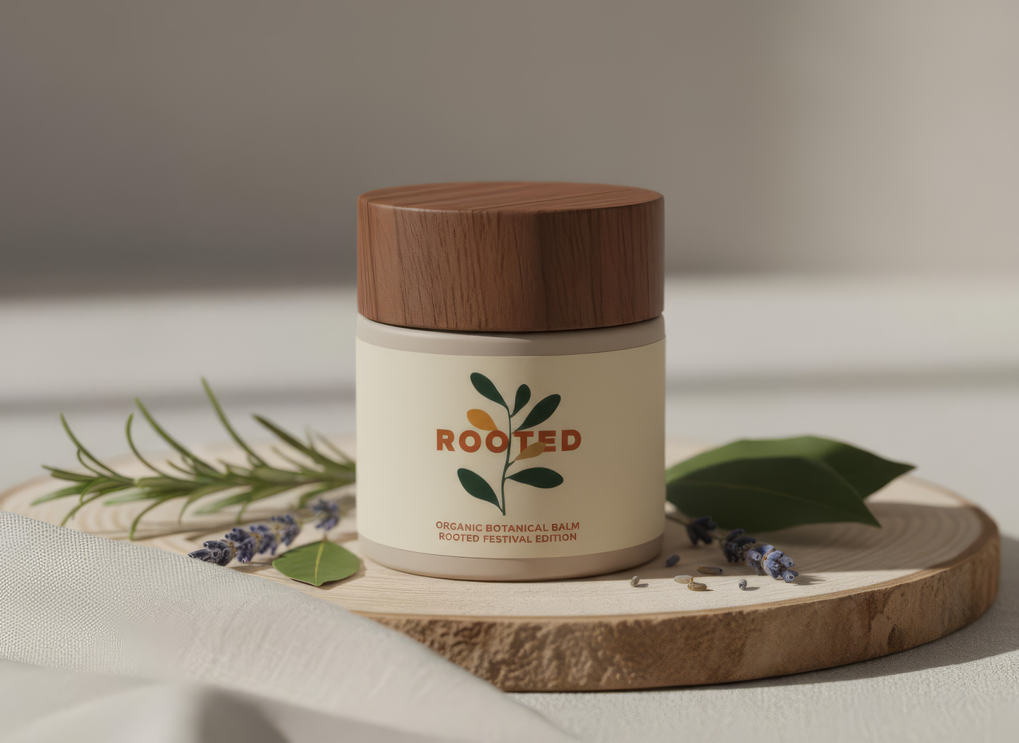 промпт (бальзам) — Small cosmetic jar for the «Rooted» festival — organic balm. Minimal label with the logo, matte beige or green container. Clean composition with natural materials: wood, linen, herbs. Calm, sensory, modern eco-luxury design. (Nano Banana)