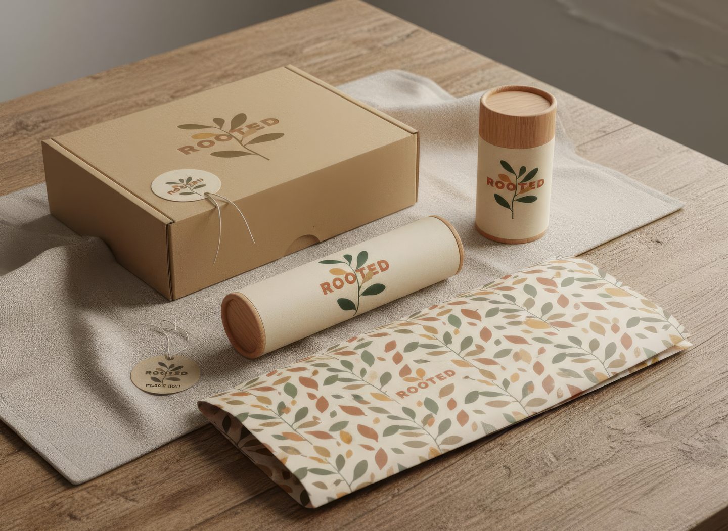 промпт (упаковка) — Packaging design for «Rooted» merchandise. Boxes and wraps in warm earthy tones with embossed or printed logo. Natural textures — paper, wood, linen. Soft shadows, balanced composition, modern organic branding aesthetic. (Nano Banana)