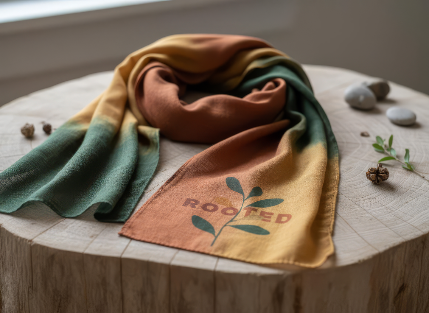 промпт (шарф) — Lightweight natural fabric scarf designed for «Rooted» festival. Soft hand-dyed gradient in earthy tones. The «Rooted» logo subtly printed near the edge. Draped composition, soft natural lighting. Feels artistic, tactile, nature-inspired. (Nano Banana)