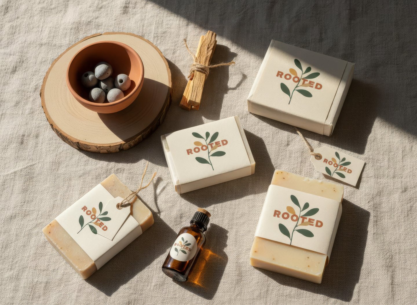 промпт (мыло) — Handcrafted soap bars and self-care items branded for «Rooted» festival. Minimal paper wrap with logo in warm tones, natural textures — linen, wood, clay. Styled in organic flat lay with sunlight and shadows. Calm, artisanal, modern aesthetic. (Nano Banana)