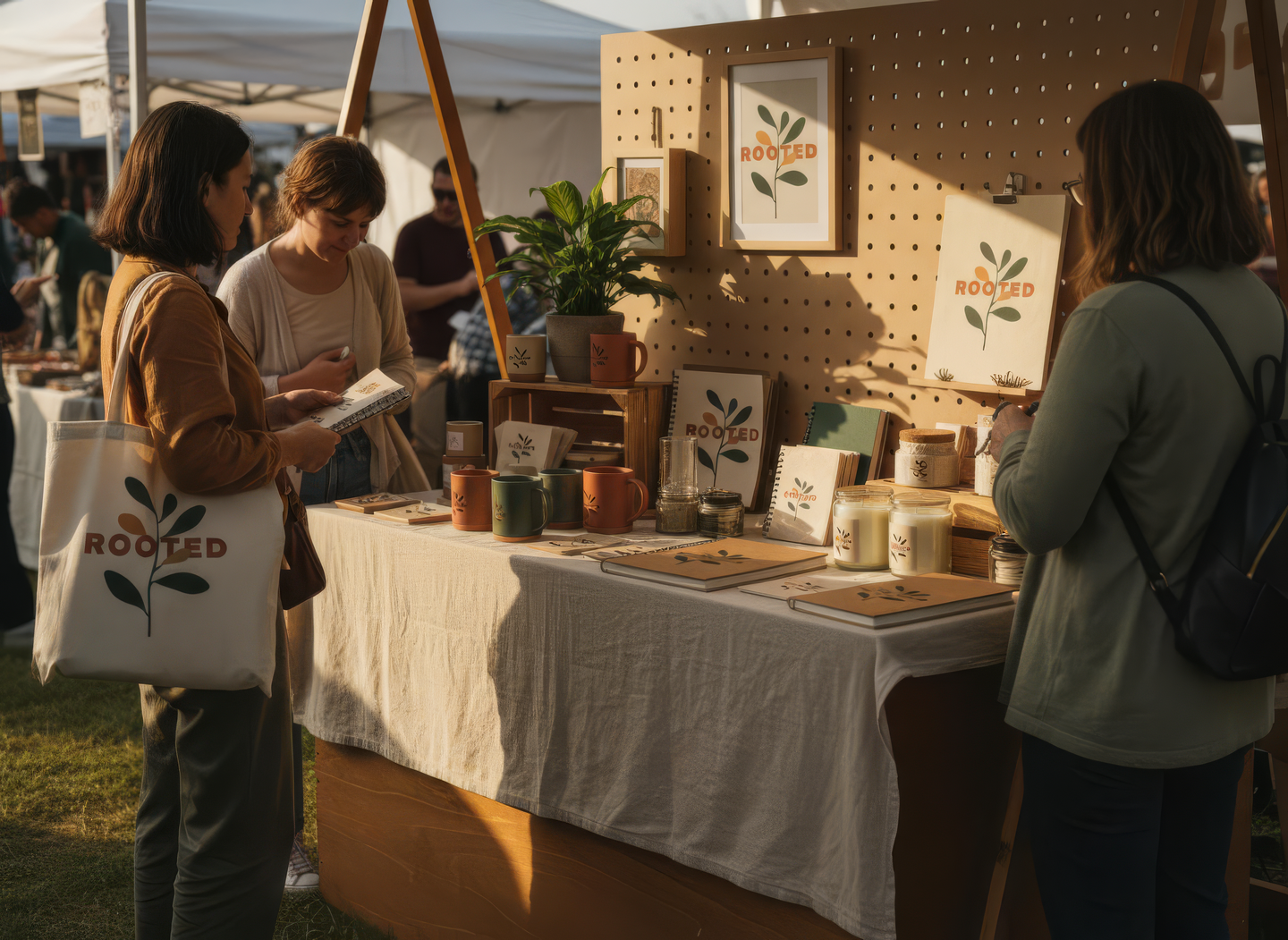промпт (прилавок) — Festival market table with «Rooted» merchandise display. Wooden counter, linen cloth, calm natural setup. Products include mugs, bags, notebooks, candles with the logo. People browsing calmly in soft sunlight. Warm earthy atmosphere, modern craft aesthetic. (Nano Banana)