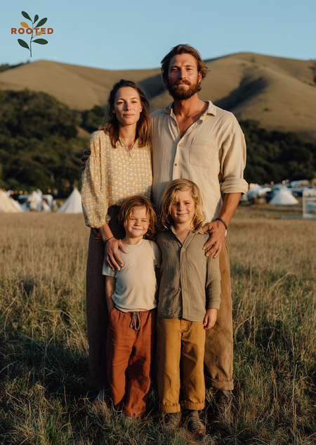 промпт (обложка проекта) — Photorealistic cinematic scene of a family of four standing on a gentle grassy hill at sunset, the «Rooted» festival glowing softly in the background with small tents and lights. Golden light, long shadows, natural smiles, feeling of peace and belonging. Earthy color palette with beige, olive, and terracotta tones. --ar 2:3 --raw (MidJourney)