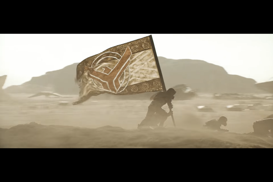 Мне кажется такой акцент на разности в доспехах дает намек на неравенство сил и перспективу падения дома Атрейдесов. Более расслабленная форма дома Атрейдесов темно-зеленая, также приспособленная к прошлым условиям жизни, они выделяются на песчаном пейзаже Дюны. Зеленое знамя, зеленая одежда, дом Артрейдесов инороден Арракису.