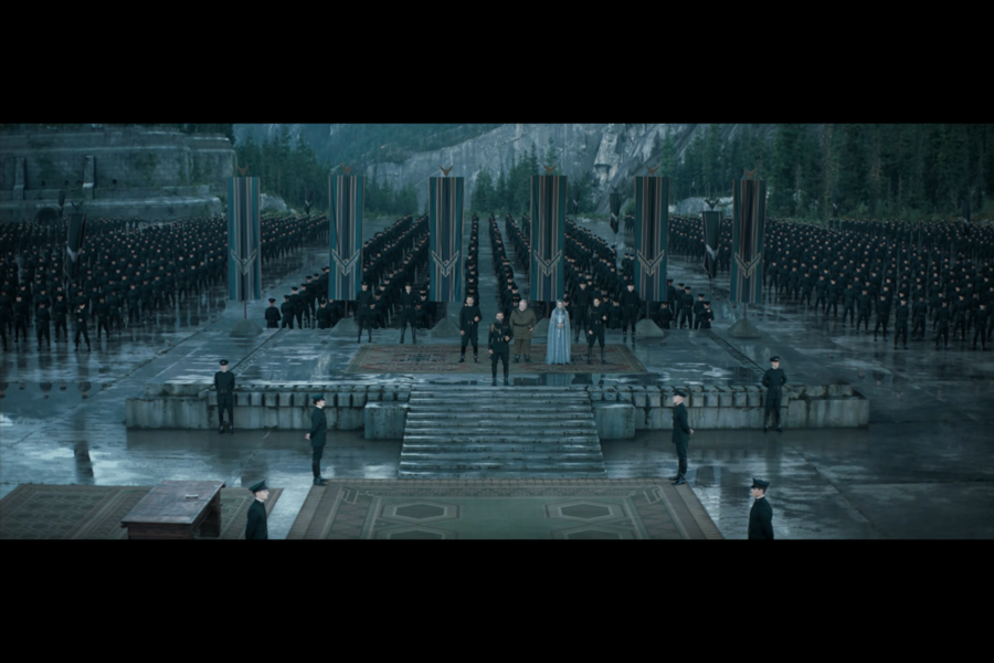 Также хочется заострить внимание на констрастах в костюмах в сцене штурма дворца. Сардаукары в этом поединке безликие жестокие воины, они машины для убийств. Атрейдесы не скрывают своих лиц. Естественно, на них напали, одеваться в полное обмундирование не было времени, однако такой контраст показывает борьбу человечности и жестокости, чести и интриги. Также мы редко видим армию Атрейдесов с покрытыми лицами, их враги обычно скрывают лицо. Все для того, чтобы провести четкую грань между хорошими и плохими ребятами в истории. Зрители должны знать лица положительных персонажей, даже если они второстепенные. Открытое лицо выделяет среди безликой массы, внушает доверие.