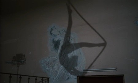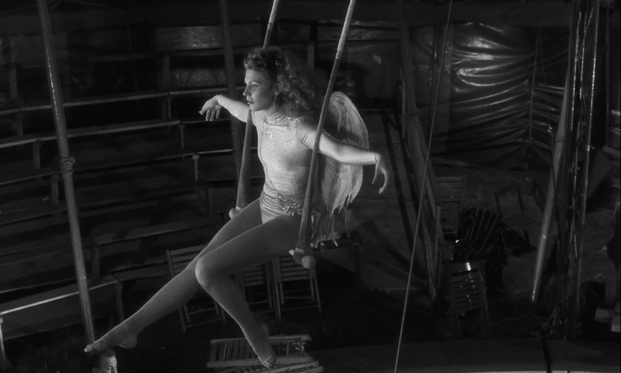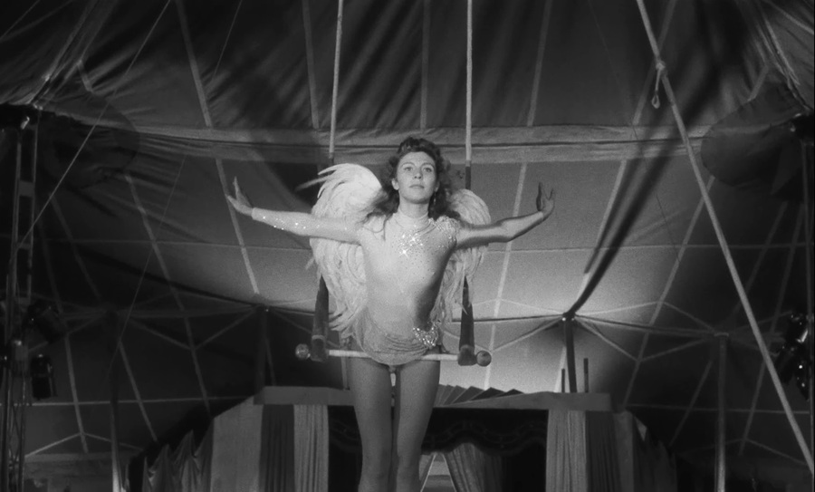 Ахроматизм прерывается впервые при «знакомстве» Дамиэля с акробаткой Марион. И если предполагать, что цвета ассоциируются с человеческими чувствами, то в этой сцене ангел влюбляется в циркачку. Ее чистые белые крылья и костюм создают ей поистине божественный и невинный образ. А на фоне голубого купола цирка, напоминающего небо, Марион превращается в мечту, за которой потом и последует Дамиэль.
