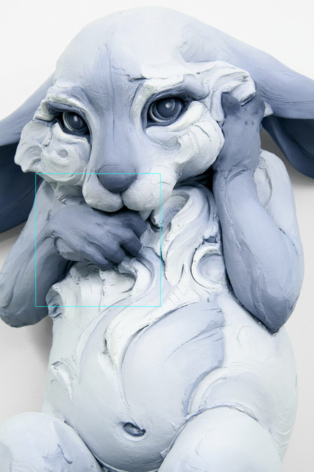 Отдельного рассмотрения заслуживает работа «Кормить». Профессионально исполненное сочетание эмоции, запечатлённой во взгляде персонажа, его широко открытой пасти и прижатых ушах, с агрессивным красным цветом и тёмными градиентами передаёт целую палитру чувств тревоги, страха, сметения и боли.
