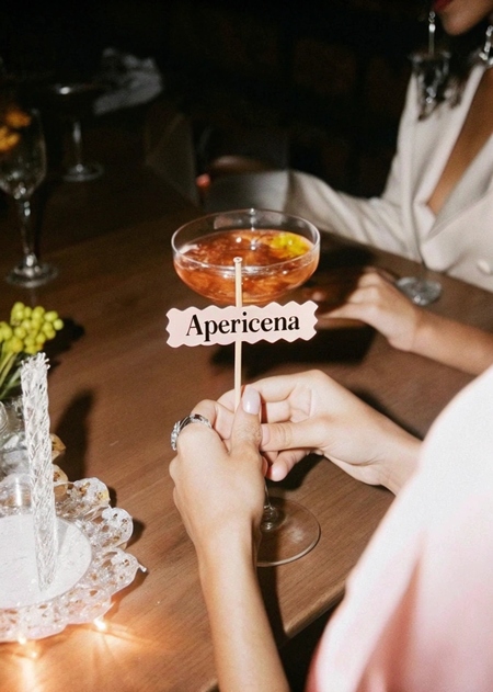 /a close-up of a cocktail, with a plaque on the skewer «APERICENA»