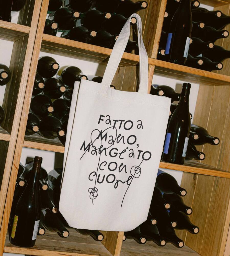 /a minimalist paper takeaway bag in deep green. The APERICENA logo in a clean, a light sandy beige, soft focus background