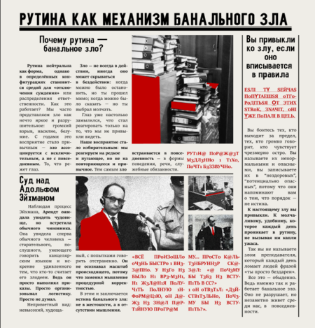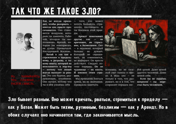 Визуально-философский лонгрид посвящен двум полюсам зла: экстатическом и яростном у Батая и рутинном, незаметном у Арендт. Через тексты, графику и анимации читатель проходит путь от крика до молчания, от предела до подчинения, чтобы столкнуться с главным вопросом.