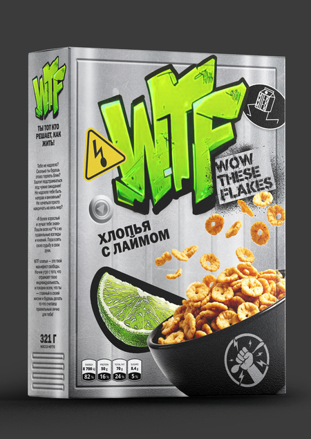 Упаковка хлопьев «WTF». Сам нейминг является аббревиатуры от — Wow these flakes. Хлопья сделаны для подростков которым надоело слушать что для них хорошо и что нужно делать с их жизни! Для тех которые хотят быть более самостоятельные и независимые, и хотят жить по своим правилам!