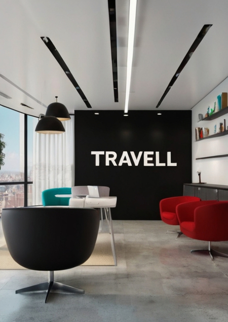 3. Генерация пространства, офиса — LeonardoAI Промт — Create a travel agency office in these colors: white, black, turquoise, red. White color predominates over others. Travel agency mascot — Birdie guide. The name of the agency is «ITravel». There are several people in the office and they are talking. The office has a relaxed atmosphere.