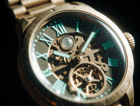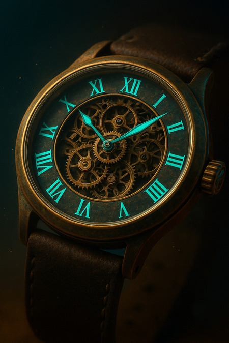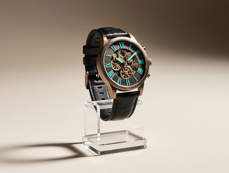 TickKing Arc I wristwatch product photo in a professional studio setting, close-up, clean commercial composition. The watch stands upright on a transparent acrylic display stand, surrounded by soft neutral background tones. Antique brass and patinated bronze case with visible planetary gears through a crystal, holographic turquoise Roman numerals glowing gently on the dial. Balanced key and fill lighting from both sides, soft reflections on metal, shallow depth of field emphasizing craftsmanship. Shot for luxury e-commerce catalog — high-end, crisp, elegant, ultra-detailed, 8k, high dynamic range, film grain. Negative prompt: lowres, blurry, text, watermark, dust, reflections obscuring details, oversaturated colors.