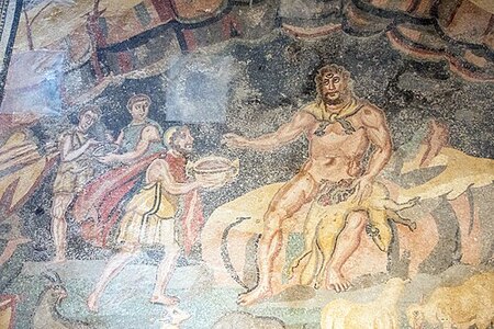 Данная мозаика представляет один из самых популярных и драматичных эпизодов произведения, из 9-й песни поэмы, где Одиссей и его спутники оказываются у циклопа-людоеда Полифема. Однако здесь запечатлено не то, как они его ослепляют, а как опаивают вином для того, чтобы ослепить и тем самым спастись от участи быть съеденными. Этот момент очень важен так, как он символизирует победу ума и хитрости, которые олицетворяет Одиссей, над грубой силой, которую олицетворяет Полифем. Иными словами. это учит читателей (а вместе с тем и зрителей) о том, что даже в самой, казалось бы, безнадёжной ситуации можно найти выход, используя умственные способности и смекалку.
