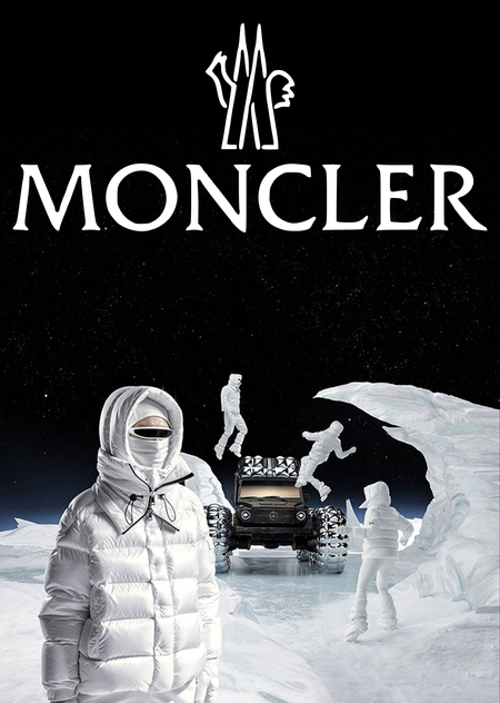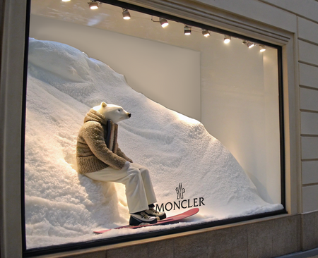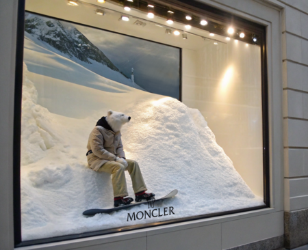 Зимняя тематика. Поскольку Moncler — это бренд, ассоциирующийся с горами и холодом, витрины часто передают атмосферу зимы. Часто в витринах появляются сцены катания на лыжах.