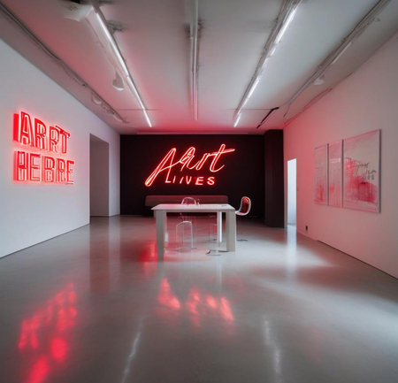 Пример промпта: A sleek interior of a modern art gallery featuring a striking neon sign that says 'Art Lives Here' in bold white and red colors. The neon sign contrasts against a polished concrete wall, surrounded by minimalist furniture and abstract sculptures. The room is softly illuminated by the neon glow, creating an artistic and sophisticated atmosphere.