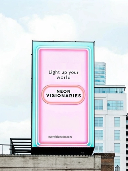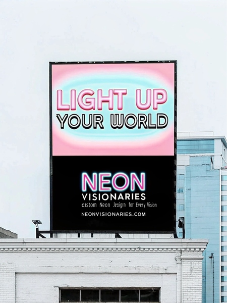 Design a large, eye-catching billboard for a company that creates neon signs, to be displayed on the side of a building. The background should be clean and minimalistic, either pure white or matte black, to emphasize the vibrant neon elements. In the center, feature a glowing neon sign with the text 'Light Up Your World' in bold, vivid colors. Below it, include the company name, 'Neon Visionaries' in a sleek neon-inspired font, with a tagline like 'Custom Neon Designs for Every Vision.' Incorporate a subtle website URL, 'neonvisionaries.com' at the bottom in a smaller, contrasting neon hue. The billboard should highlight the artistic and modern appeal of neon signage while standing out against the urban skyline.