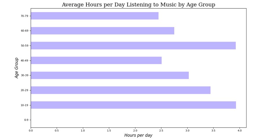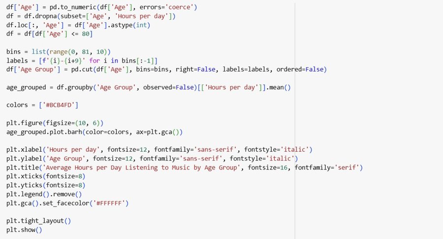 Исходя из результата данных, визуализированной столбчатой диаграммой о влиянии возраста на время прослушивания музыки, стало известно, что наибольшее внимание уделяют этому младшее и старшее поколение. Это объяснимо тем, что и подростки особенно стремятся исследовать творчество, укреплять социальные связи и усиливать моменты жизни музыкальным воздействием. Люди старше в свою очередь склонны к ностальгии, и музыка позволяет справляться с возможным одиночеством и скукой.