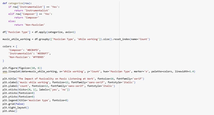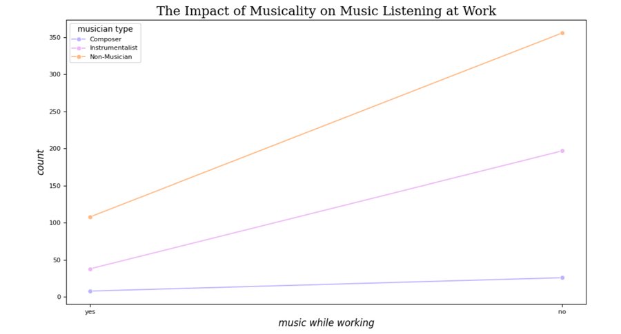 Результаты линейной диаграммы оказались разнообразными: композиторы в целом слушают музыку меньше всех (смею предположить: из-за наиболее глубокого погружения в эту сферу, тем более создания своего материала. Это может позволить сконцентрироваться на оттачивании своего видения и стиля без учета множества существующих примеров). Инструменталисты стали золотой серединой, а несвязанные с таким видом творчества люди имеют наибольшее количество ресурса и интереса для погружения в музыку и снижения стресса при обычной работе.