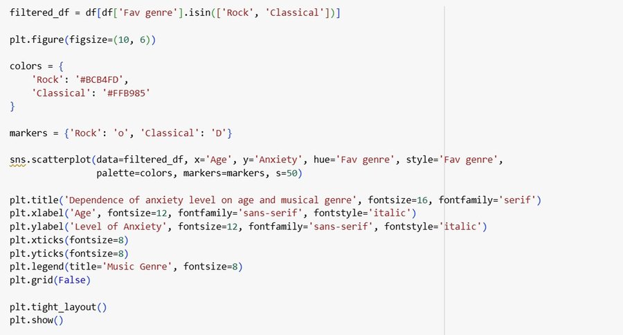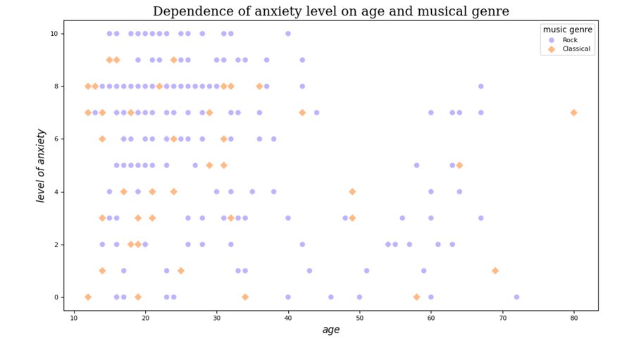 В ходе исследования данных для точечной диаграммы было решено проверить теорию о том, что тяжелую музыку по типу рока слушают люди с высоким уровнем тревожности, в то время как классику предпочитают более уравновешенные личности.