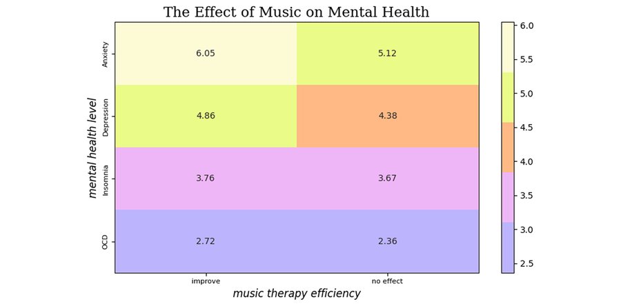 С помощью тепловой карты было проведено наглядное исследование, насколько эффективной оказывается музыкальная терапия в ходе облегчения симптомов различных тревожных расстройств. Результат оказался однозначным: это действенно. Разница между показателями невелика, но существует.