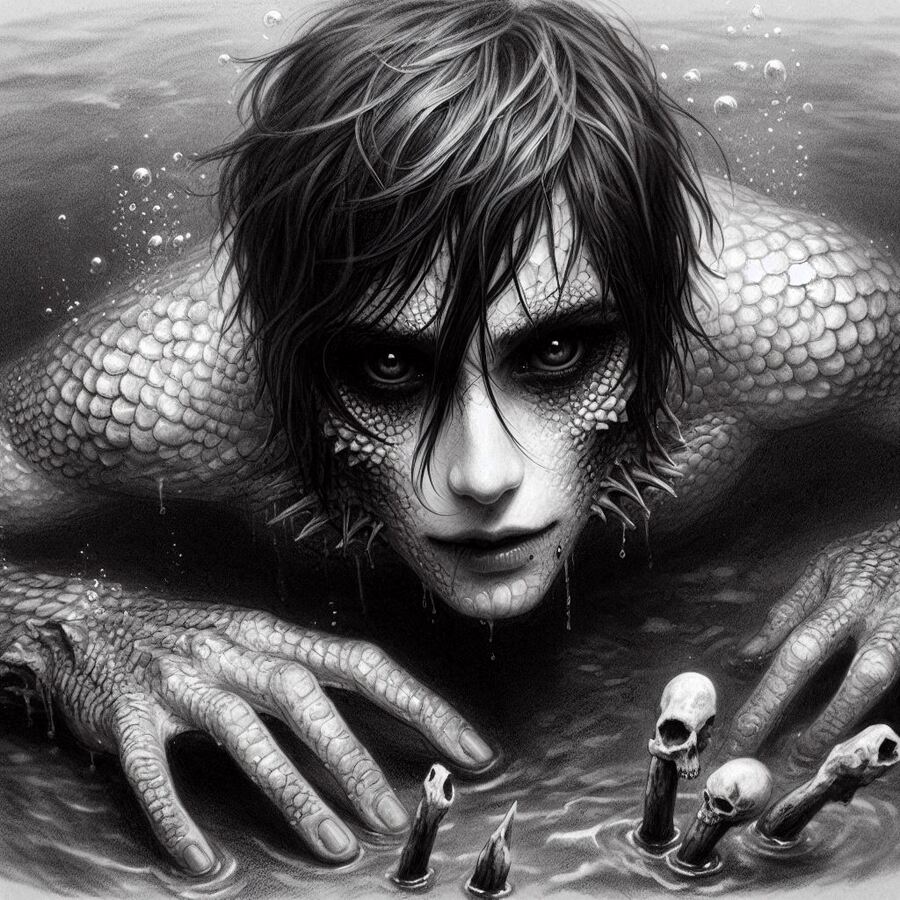 [A young male with very pale skin completely covered in scales.His entire face is covered in scales, scales on his nose and lips. He has long black hair, black dark eyes. He looks up at us from beneath the water column. He creates a sense of lurking danger. He stretches his arms toward us. His hands are in scales. Sharp rocks, skulls stick out of the water near the man. Monochrome expressive charcoal sketch, very dark and gloomy]