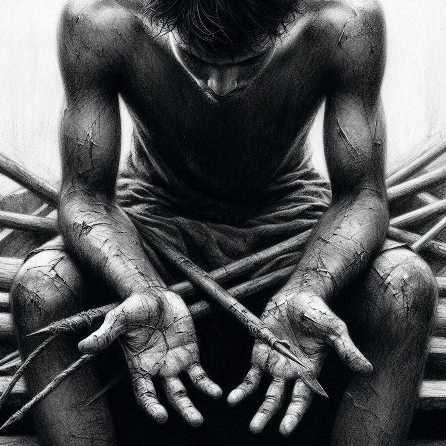 [A young man holds a harpoon and looks at his hands. His hands are covered with a very large number of scars. We cannot see his face. The man is sitting in a boat. It’s a Monochrome expressive charcoal sketch, very dark and gloomy]
