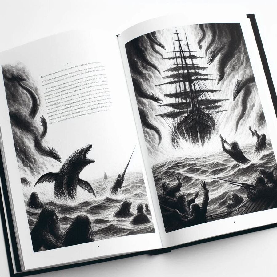 [Book spread. White paper with text and a wide illustration across the top. The illustration is done in charcoal. It shows A dilapidated sailing ship that is engulfed in flames. It is attacked by mermaids with scaly skin. Sailors jump out of the ship and scream in fear. Some of the sailors shoot harpoons at the mermaids. Commercial photography on a white background. The book has a black cover]