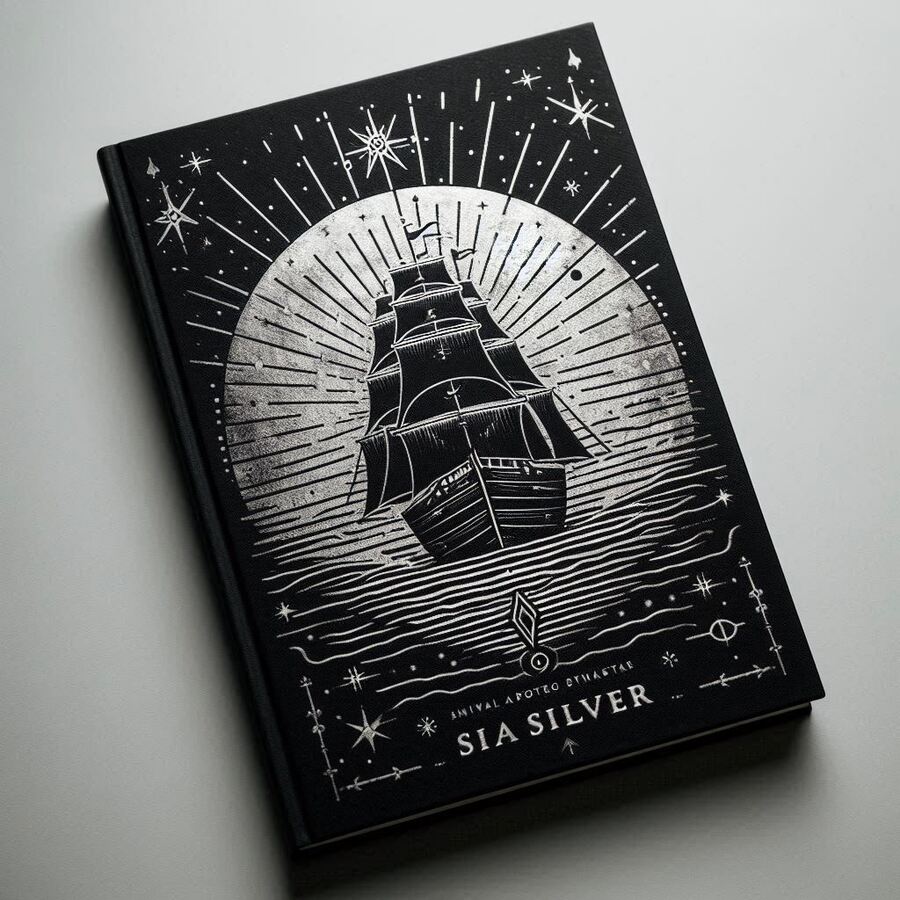 [A book with a black cover. The cover emphasizes the mystical content of the book. Black and white colors. The title on the cover is «Sia Silver». A ship is drawn on the cover. Cover is slightly chipped this is part of the design. Commercial photography]