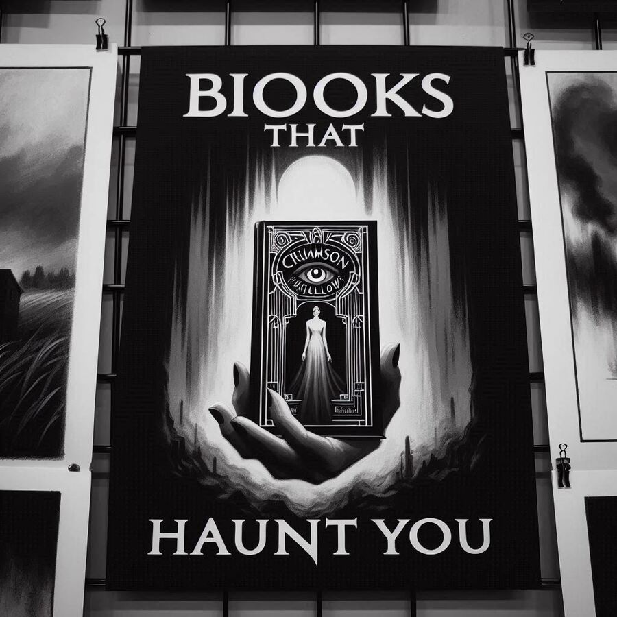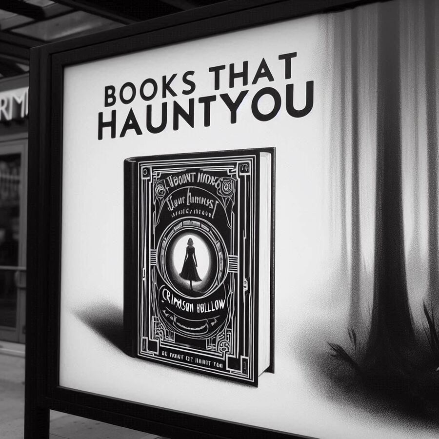 [Photo of a poster advertising a book. The poster has the slogan «Books That Haunt You» written in large letters in a serif font. The poster depicts the Book with a black and white art deco cover. The title of the book is «crimson hollow.» On the poster behind the image of the book is a charcoal drawing depicting a dark gloomy forest. Black and white poster style]