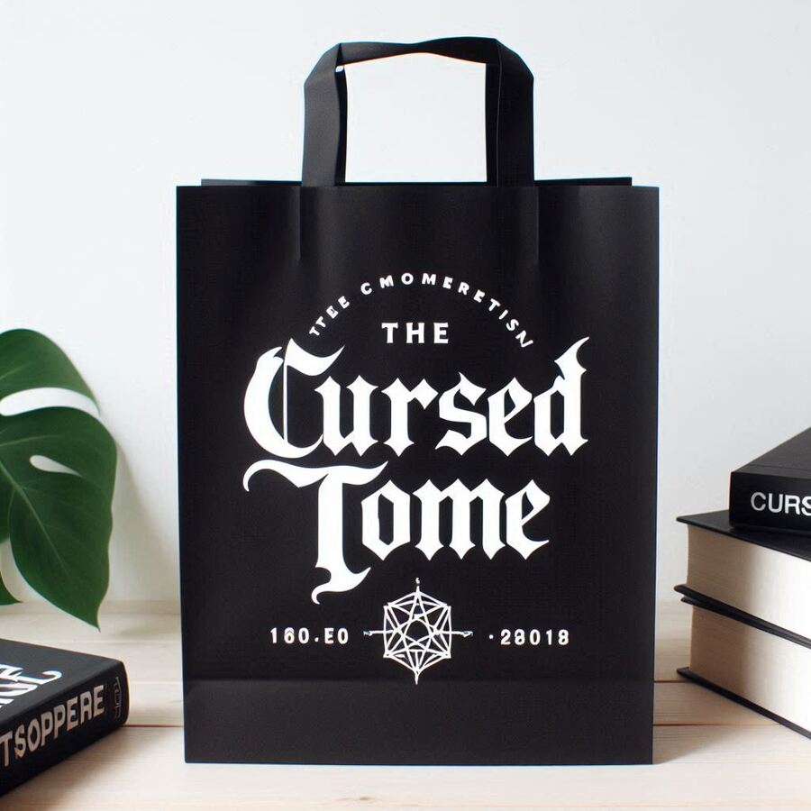 [Black Shopper. Shopper features a typographic minimalist black and white Cursed Tome logo. The photo is on a white background]