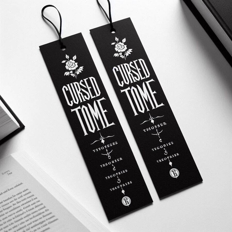 [Long black bookmarks for books. The bookmarks feature a typographic minimalist black and white «Cursed Tome» logo. The photo is on a white background]