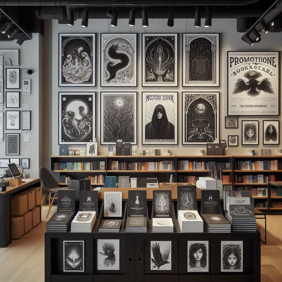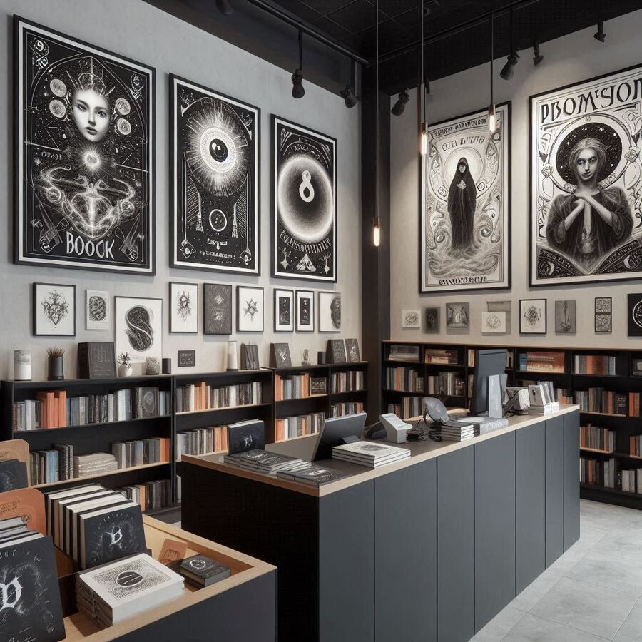 [Interior of a modern bookstore. Inside there are several promotional signs and posters in serif font. The posters depict books or charcoal illustrations of mystical subjects. Along the walls are Black and White bookshelves with books and a counter with a cash register. The interior is modern but creates a sense of mystery. Commercial photography]