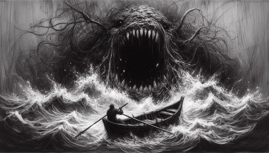 [A small boat in the midst of raging waves. On the boat sits a man who is fighting off a large monster with a spear. The monster looms over the boat with its huge mouth wide open, which looks like a huge black tunnel. The monster is dark and shapeless, composed of mud, seaweed, rocks and twigs. Monochrome expressive charcoal sketch, very dark and gloomy]