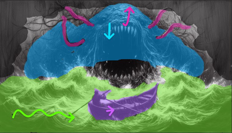 [The waves are rocking slowly, the boat is rocking the waves slowly, the monster is screaming and bending over]