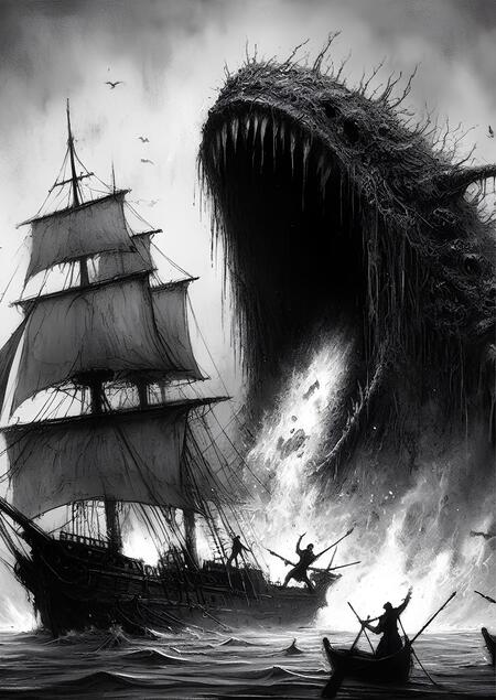 [A dilapidated sailing ship that is engulfed in flames. It is attacked by monster. The monster looms over the boat with its huge mouth wide open, which looks like a huge black tunnel. The monster is dark and shapeless, composed of mud, seaweed, rocks and twigs. Sailors jump out of the ship and scream in fear. Some of the sailors shoot harpoons. Monochrome expressive charcoal sketch]