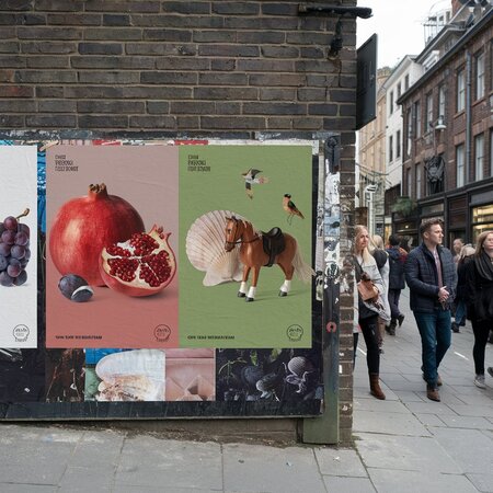 промт: Create a series of posters mock-ups where they are on the wall on the street and people are going past them. Posters are featuring a striking triangular pyramid design set against a clean white background. Each pyramid should be composed of small, detailed images of charming elements such as pomegranates, seashells, grapes, toy horses, and birds. The arrangement should be visually appealing, showcasing the unique characteristics of each item while maintaining a cohesive and artistic look. These posters will add a touch of whimsy and creativity to any space, perfect for art lovers and those who appreciate minimalist design!