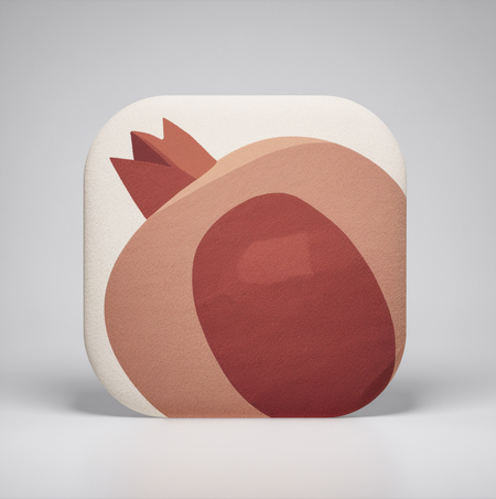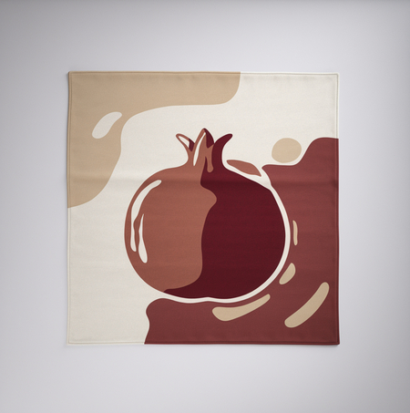 промт: Create an image of a square rug set against a white background. The rug features a cute, minimalist illustration of a pomegranate. The main color of the rug is a pale beige, while the pomegranate is depicted in a rich, brownish-red hue.