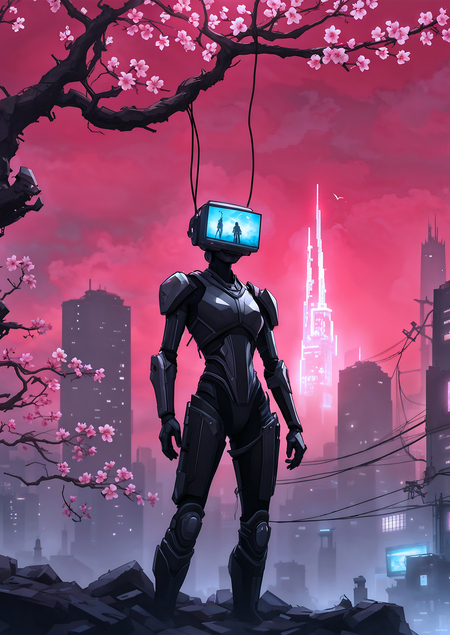 Промпт: High-quality concept art of a black, humanoid android with a screen-TV head emitting piercing light, dangling sideways from a cable affixed to a leafless, black cybernetic tree akin to a Japanese cherry blossom, amidst the foggy silhouettes of crumbling futuristic city ruins, etched against a haunting red backlit skies suggestive of a Silent Hill ambiance, entire scene imbued.