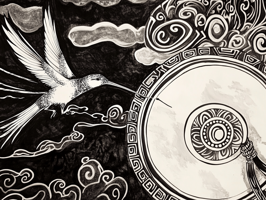 (1) black and white traditional mongolian ornament with a hummingbird hovering near a shaman’s drum, its wings blurring into a vibrant aura --ar 4:3 --stylize 0 --v 6.1 (2) https://s.mj.run/kwvcKnabiMo black and white traditional mongolian ornament with roots growing into the sky --ar 4:3 --stylize 0 --v 6.1 (3) https://s.mj.run/WW2-AaMnOJc black and white traditional mongolian ornament with A mountain range reflecting in a still lake, with ethereal lights and shapes subtly emerging from the water --ar 4:3 --stylize 0 --v 6.1