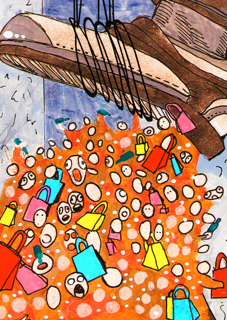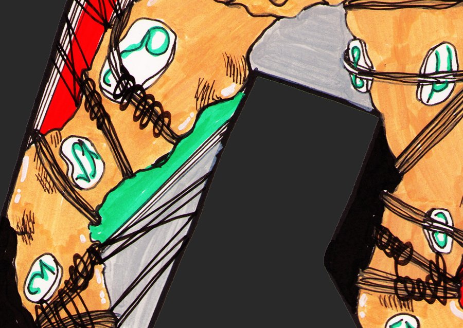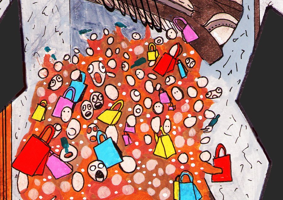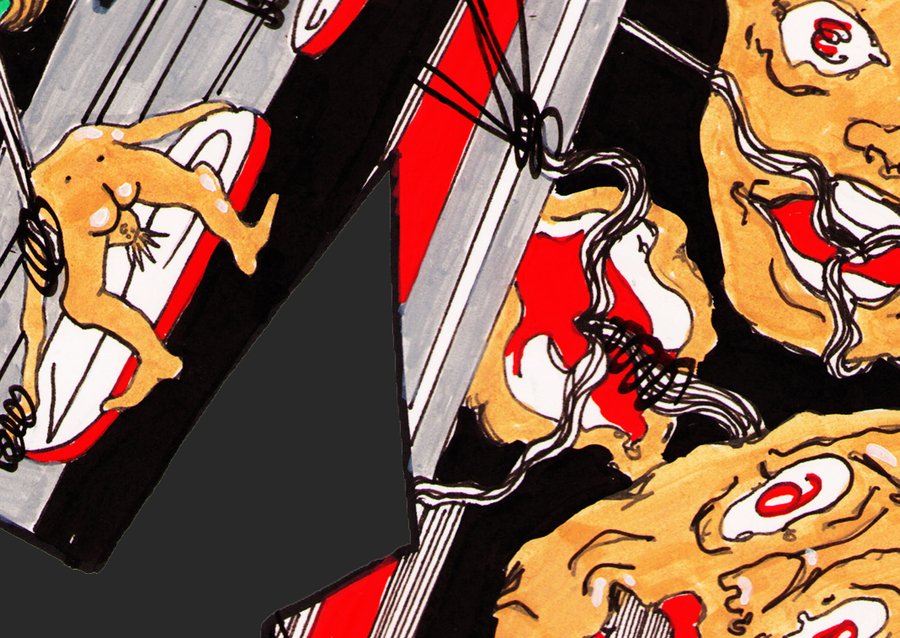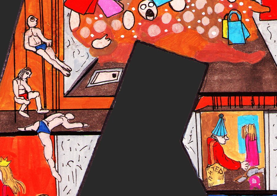 Этот лифт является пережитком северного возрождения и современного давления капитализма. Он впитал в себя эстетику картин Босха и Брейгеля. По всей картине расположены пасхалки, которые вписаны в ситуации современного времени.
