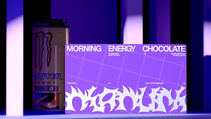 DEADLINE — утренний шоколад с низким содержанием сахара и пробуждающими вкусами. Чтобы проснуться не только телом, но и разумом. Цель бренда влиять на жизни людей с самого утра и быть ярче, чем все конкуренты, популяризируя их яркое и нестандартное решение с экзотическими добавками.