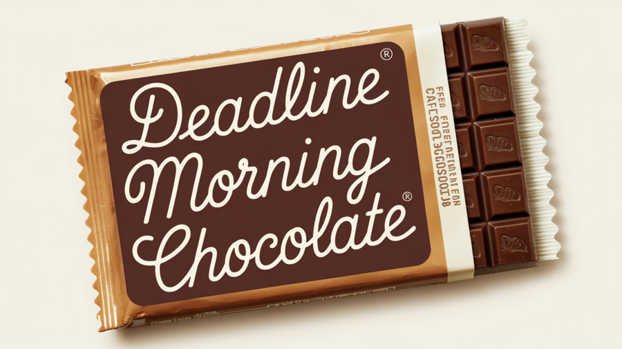 PROMT A photo of the morning chocolate packaging with the lettering style, The packaging is brown and has a label with white text that says «DEADLINE morning chocolate», There is a chocolate bar inside the packaging, the text is written in a cursive script, the overall design has vintage feel, The background is white