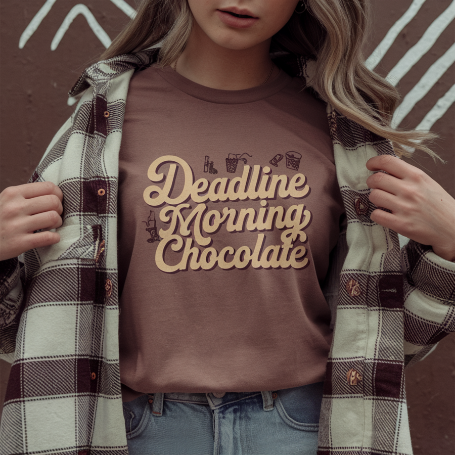 PROMT Fashion photo, girl wearing a t-shirt, t-shirt decorated with a lettering style drawing of a DEADLINE morning chocolate, The background is brown, white, The overall design has a vintage feel
