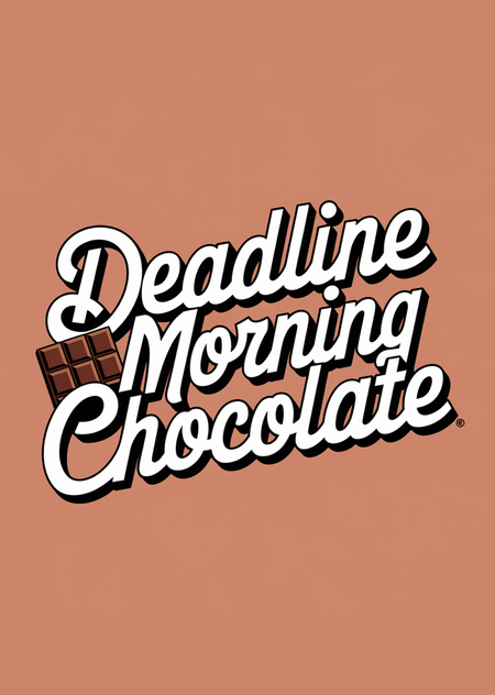 PROMT A photo of a vintage lettering signboard of a DEADLINE morning chocolate office, the signboard is in chocolate and white colors, the text «DEADLINE morning chocolate» is written in a cursive script, the signboard is placed against a white wall, the background is clean and simple, with no other objects or distractions